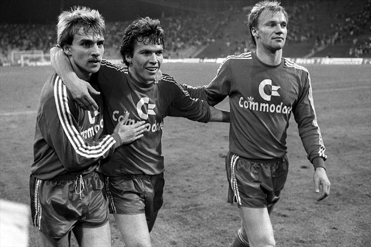 Bavarias captain Lothar Matthaeus (centre) with happy feelings after the victory of his team against Borussia Moenchengladbach, which resulted 3:2. Hans-Dieter Flick (left) and Hans Dorfner are with him. (11/12/1987)(AP Photo)