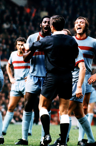 L-R) West Ham United's Clyde Best, Brian 'Pop' Robson (hidden) and Billy Bonds argue with the referee