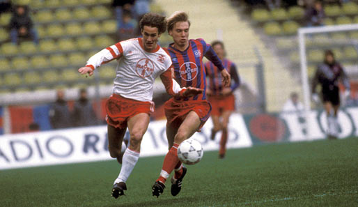 Datum: 25.08.1990  Copyright: imago/WEREK Heiko Herrlich (Leverkusen, li.) gegen Horst Steffen (Uerdingen); Vdia, quer, Zweikampf, Duell, Ball, Antritt Saison 1990/1991, Bayer 05 Uerdingen - Bayer 04 Leverkusen 1:1 Krefeld Dynamik
