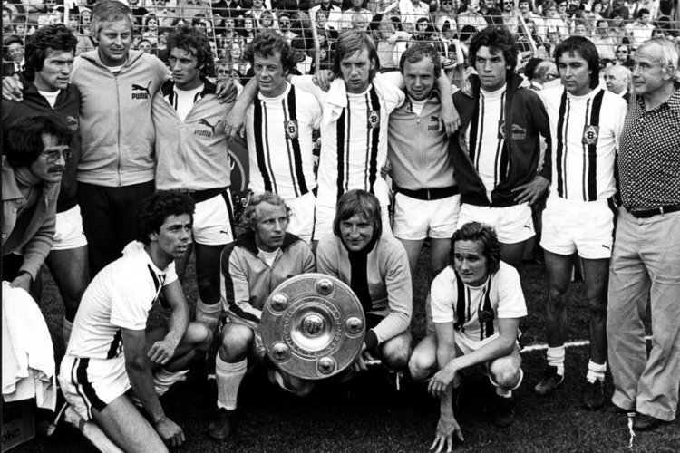 Gruppenbil d des Deutschen Meisters Borussia Mönchengla dbach nach dem Sieg am vorletzten Spieltag der Bundesliga (07.06.197 5) gegen Eintracht Braunschwe ig auf heimischem Rasen. Stehend v.l.n.r. Jupp Heynckes, Trainerass istent Karl-Heinz Drygalski, Reiner Bonhof, Wimmer, Jensen, Wittkamp, Schäffer, Danner und "Meisterma cher" Trainer Hennes Weisweiler . Vorn v.l.n.r. Masseur Stock, Klinkhamme r, Berti Vogts, Kleff und Alan Simonsen.